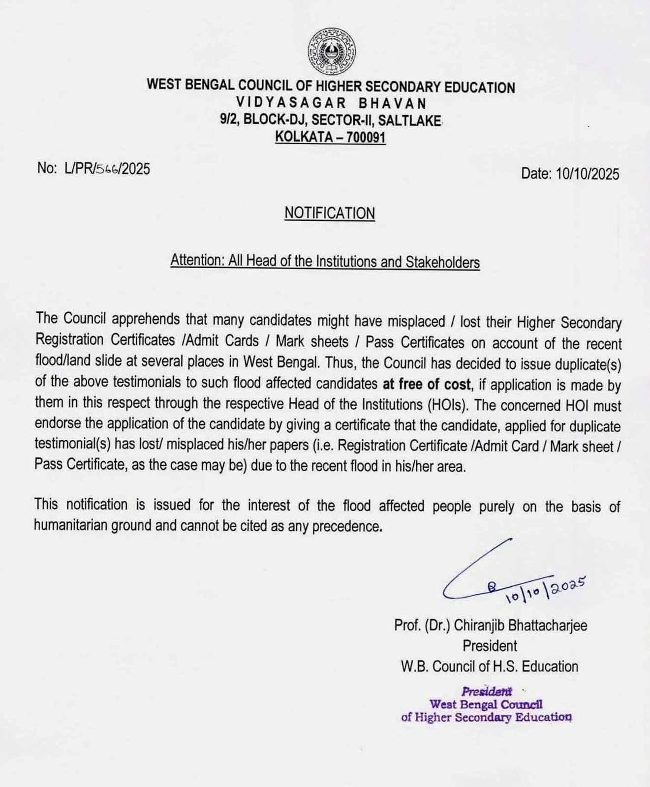 প্রসঙ্গতঃ কিছুদিন যাবৎ প্রবল বৃষ্টিতে একের পর এক উত্তর থেকে দক্ষিণ বঙ্গে জনজীবন বিপর্যস্ত হয়েছে। জলের তোড়ে ভেসে গিয়েছে বহু ঘরবাড়ি। সেই সঙ্গে হারিয়ে গিয়েছে বহু মূল্যবান দস্তাবেজ। এই সমস্ত বন্যা বিদ্ধ্বস্ত মানুষদের পাশে মানবিকতার সঙ্গে দাঁড়াতে নির্দেশ দিয়েছিলেন মুখ্যমন্ত্রী মমতা বন্দ্যোপাধ্যায়। তারপরেই উচ্চ মাধ্যমিক শিক্ষা সংসদ বন্যা বিধ্বস্ত এলাকার ক্ষতিগ্রস্তদের জন্য বিনামূল্যে সার্টিফিকেট দেওয়ার কথা ঘোষণা করেছে।